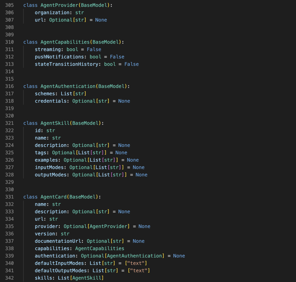 To better understand how it works here's a python AgentCard implementation: