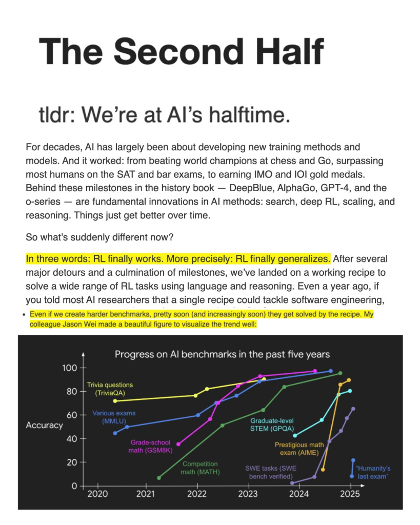 This is one of the best blog posts of 2025 by the OpenAI researcher Shunyu Yao. A playbook for what will matter most in AI research and the startup ecosystem, and how to prepare.