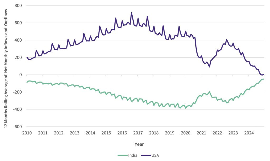 Another chart shows how the inflows / outflows of talents between the US / India is shifting the other way.