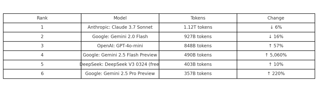 Top models according open router, notable how Gemini 2.5 is climbing the ladder, while anthropic 3.7 is slowly going down.